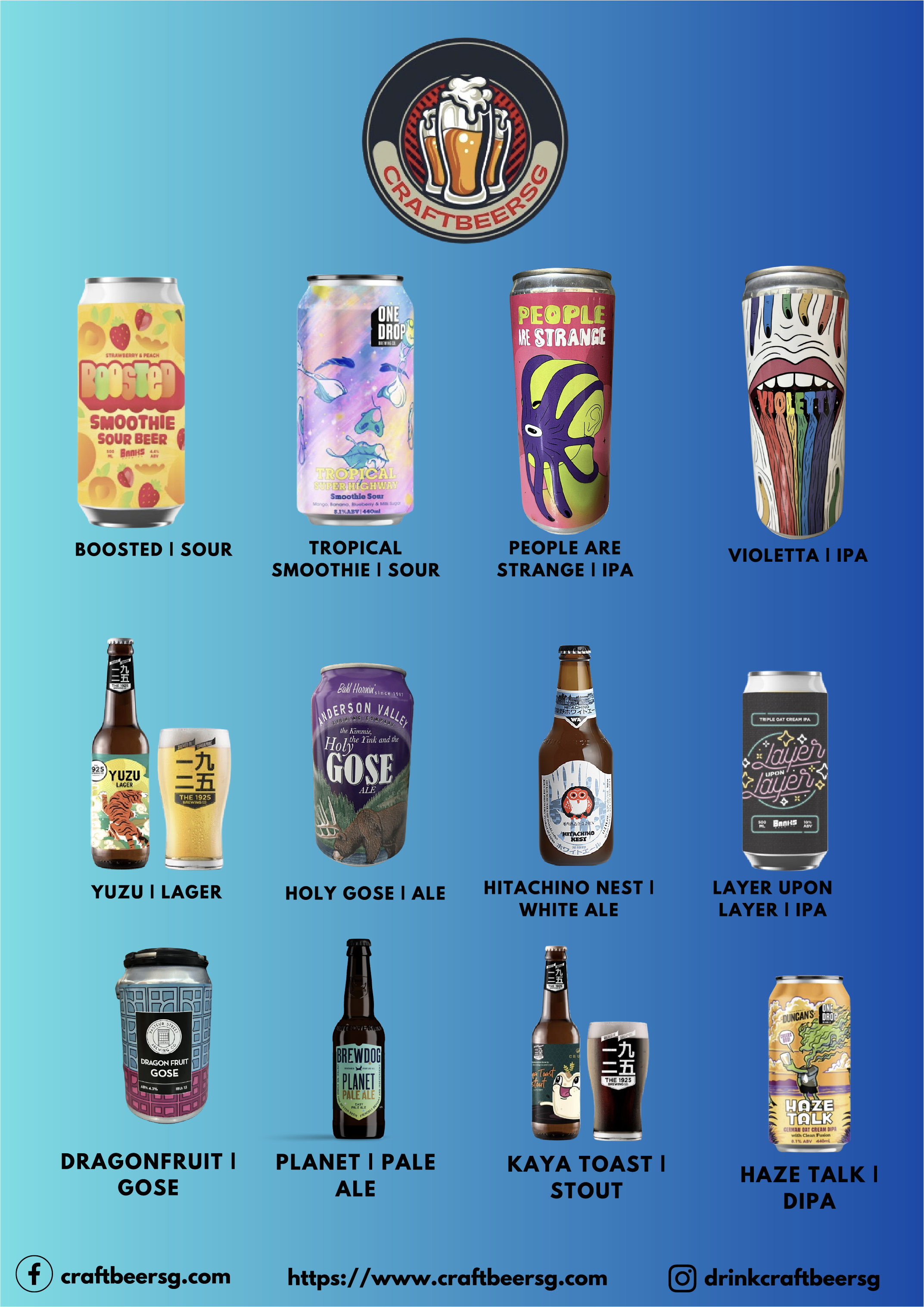 An online retailer of Craft beers apart from other alcoholic beverages like Gin, Vodka and Rum. Website: www.craftbeersg.com Facebook: craftbeersg.com, Instagram: drinkcraftbeersg.